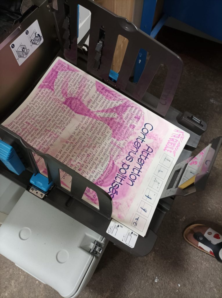 En 21 heures chrono, nous devions concevoir un ou plusieurs fanzines, tirés à au moins 75 exemplaires, autour d’un thème imposé : « remise en forme ». Nous avion à notre disposition un nombre limité de 500 feuilles A3, nous avons du imaginé plusieurs formats imbriqué dans ce format pour créer un ensemble d’éditions.