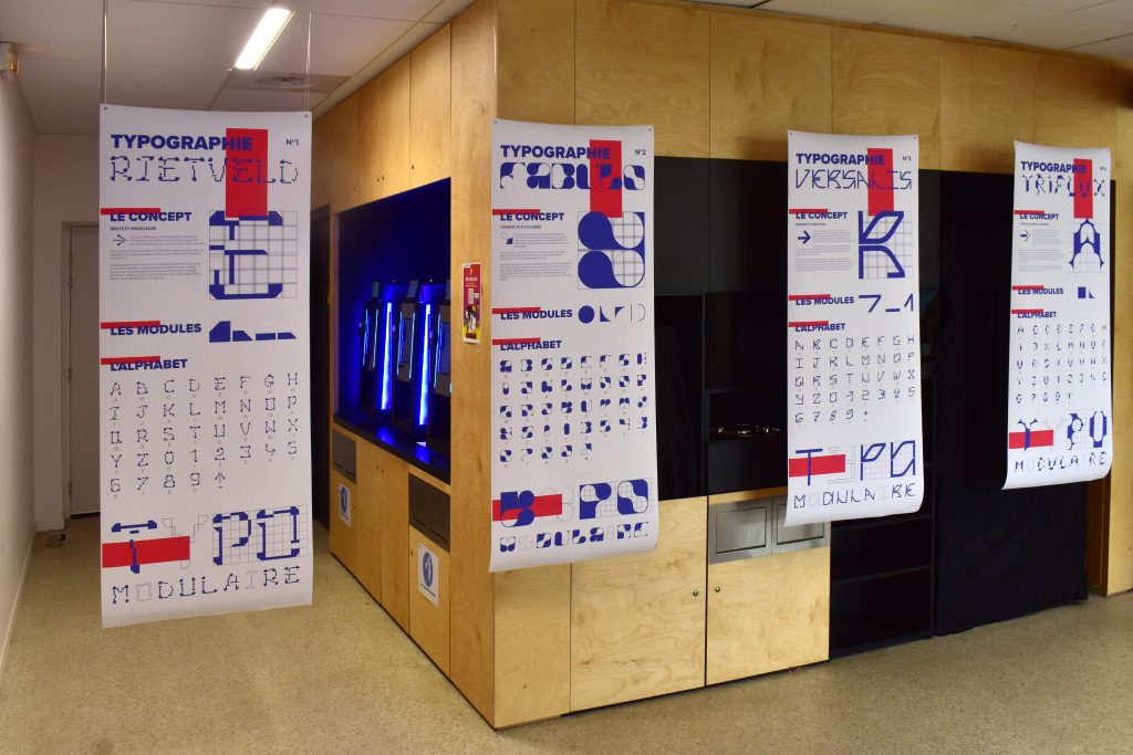 L’exposition présentait également les recherches en dessin de caractères réalisées par les étudiant·es de 3ᵉ année design graphique qui ont ensuite été utilisé dans la signalétique de l’exposition.